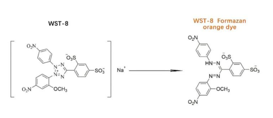 在活細(xì)胞線粒體內(nèi)的脫氫酶催化下,WST-8被還原,生成高度水溶性的橙色甲瓚產(chǎn)物。